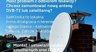Satklinika to firma oferująca profesjonalny montaż i serwis anten telewizyjnych, systemów alarmowych oraz monitoringu CCTV. Działamy na terenie całego Śląska – w tym Katowice, Tychy, Żory, Gliwice i okolice. Zapewniamy szybki dojazd, nowoczesny sprzęt i fachowy montaż anten naziemnych, satelitarnych i LTE. Oferujemy również instalację alarmów i kamer z podglądem na telefonie. Postaw na doświadczenie i bezpieczeństwo – zadzwoń: 666 555 844.